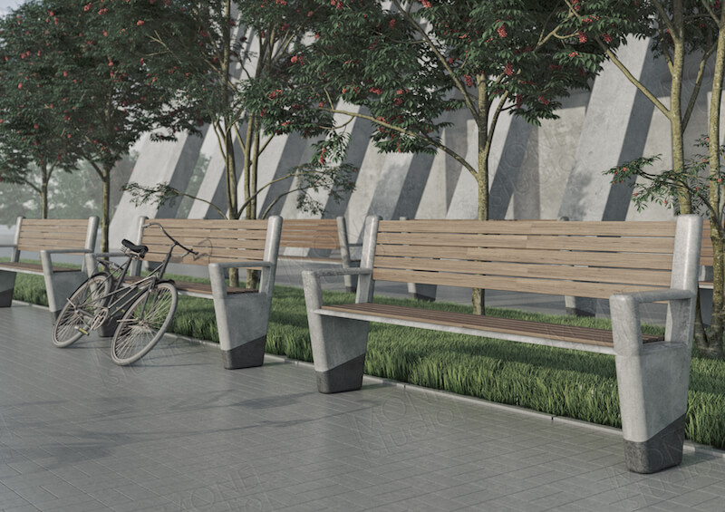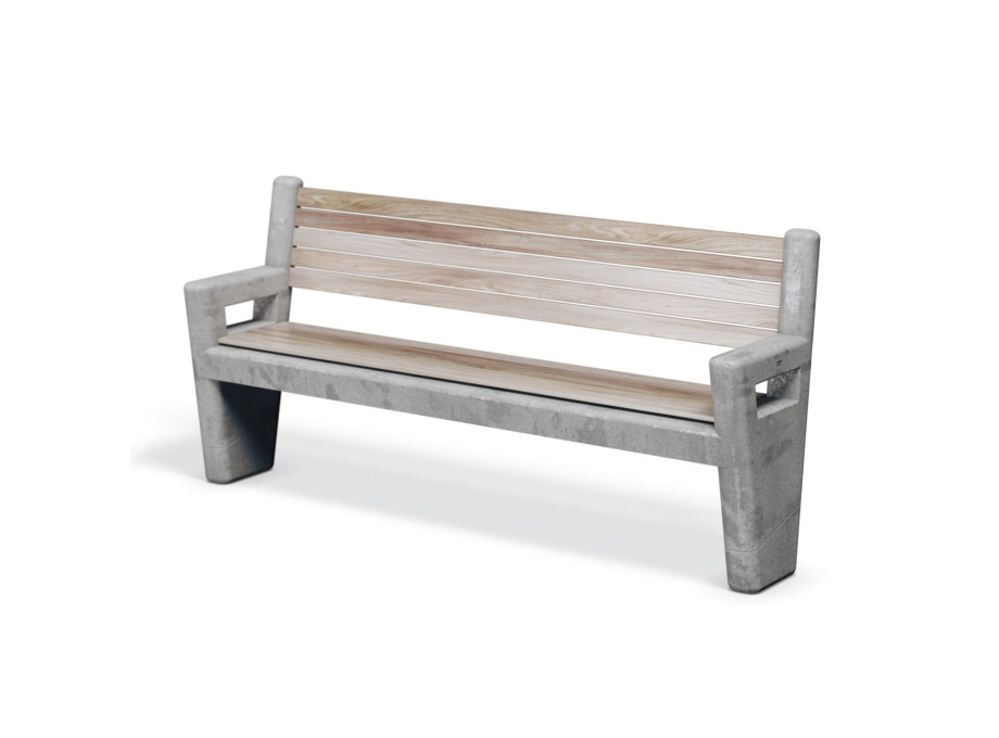 Удобная скамья из бетона Итака от нашей мастерской выполнена с деревянной спинкой для комфортного времяпровождения.